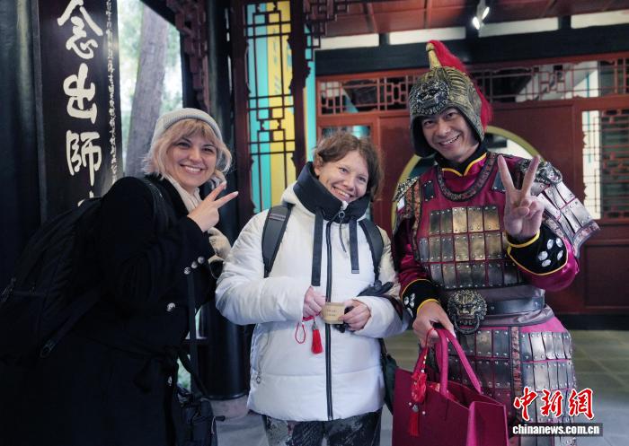 图为武侯祠专物馆身着铠甲的 “兵士” 取中邦乘客开影纪念。中新社记者 安源 摄