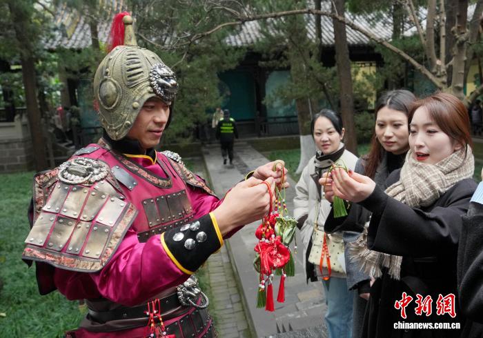 图为武侯祠专物馆身着铠甲的 “兵士” 为旅客赠予“丞相锦囊”。中新社记者 安源 摄
